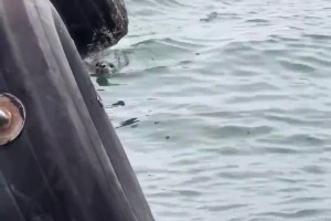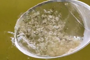 黑鱼苗脱了壳衣后,男子用漏勺将水面上的壳衣捞起