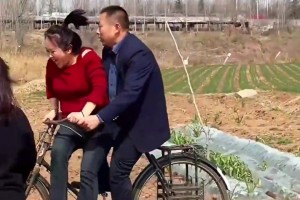 姐妹俩体验儿时“二八大杠”的快乐,姐姐刚上去车就塌了